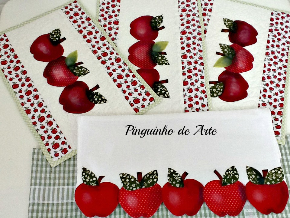 Quase não faço nada com patchcolagem porque não sou muito fã de fazer caseado.Resolvi testar aqueles termocolantes que dispensam o caseado,vocês conhecem?Eu gostei do resultado.Fiz um guardanapo e um jogo americano.Dei uma sombreada nas maçãs para realçá-las.Também não sou boa na pintura não,mas vou tentando,uma hora eu chego próximo das pintoras maravilhosas que vejo pelos blogues queridos.